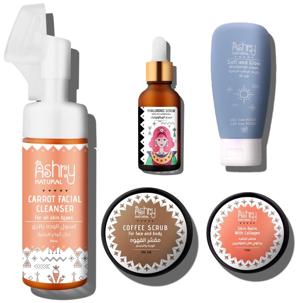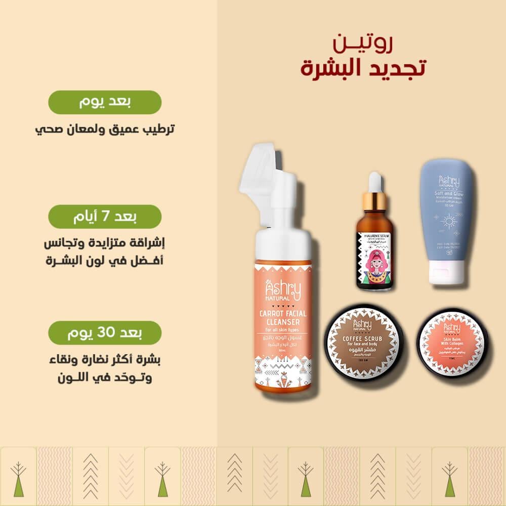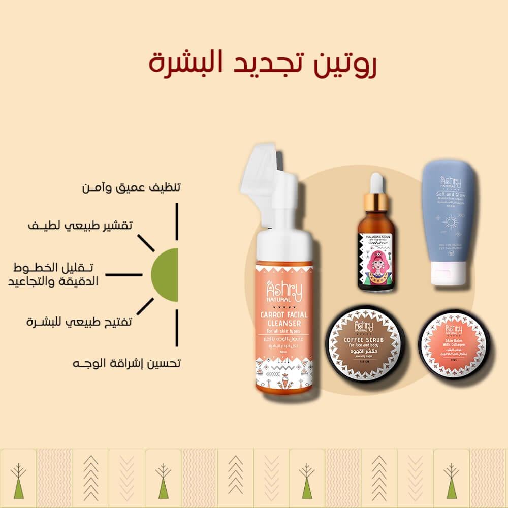 استعيدي نضارة بشرتك وامنحيها بداية جديدة مع روتين تجديد البشرة الطبيعي منAshry Natural. تركيبة متكاملة تم تصميمها بعناية لتناسب احتياجات البشرة المتعبة، وتعزز تجدد خلاياها بطريقة طبيعية وفعّالة، دون مواد كيميائية قاسية.