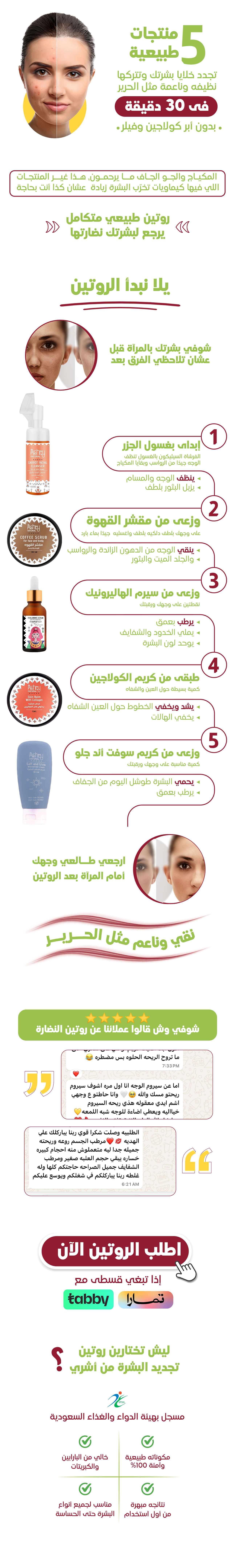 يحتوي الروتين على 5 خطوات مدروسة تجمع بين التنظيف، التقشير، الترطيب، التغذية، وتحفيز الإشراقة: