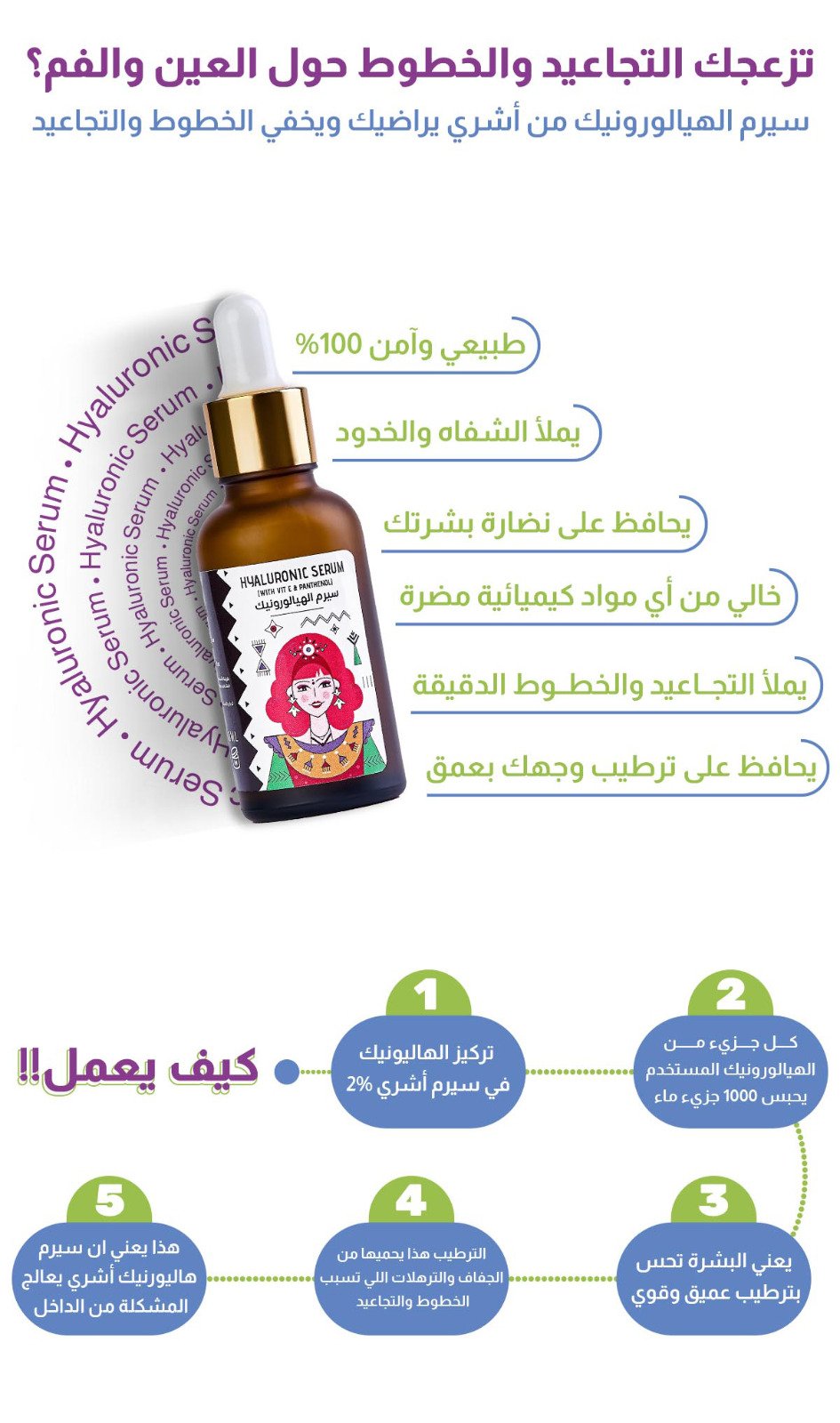 هل تبحثين عن سيروم للتجاعيد يعالج الخطوط ويرطب بعمق؟ تركيبة طبيعية بتركيز 2% من حمض الهيالورونيك لتقليل التجاعيد وترطيب البشرة بعمق حتى 48 ساعة.