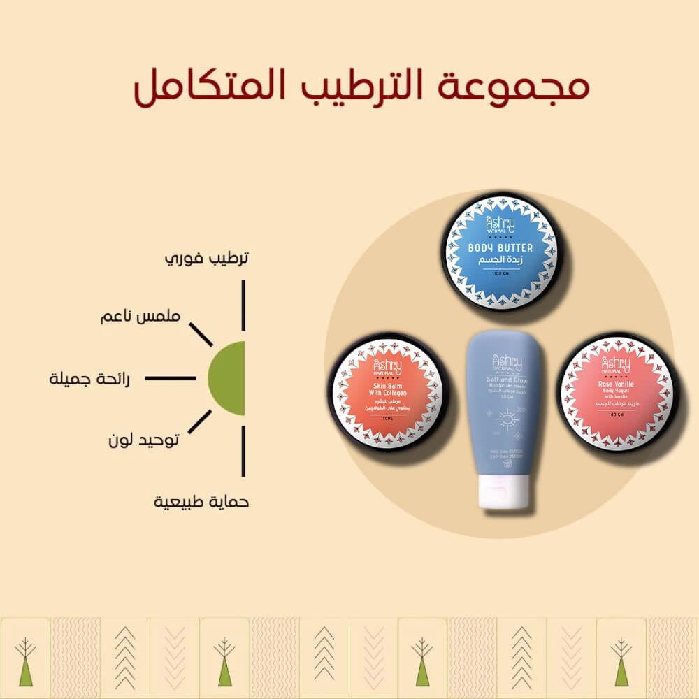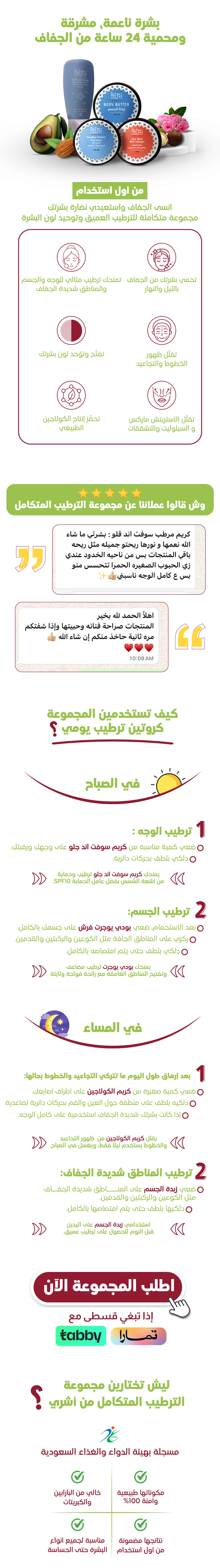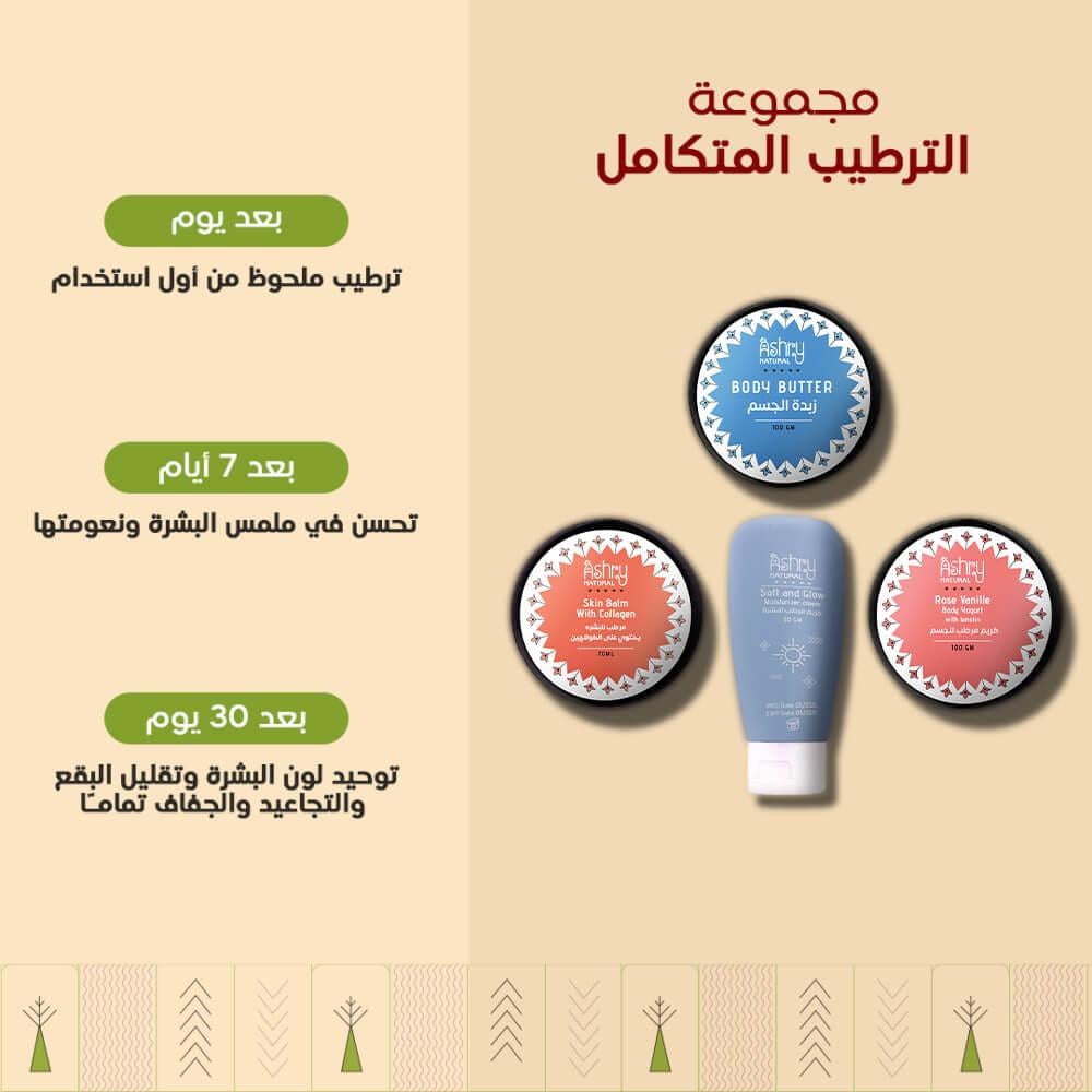 مجموعة ترطيب طبيعية من أول استخدام تمنحك نعومة فائقة، ترطيب عميق، وتفتيح للمناطق الداكنة. تركيبة فعالة تناسب جميع أنواع البشرة، وآمنة 100%. اطلبيها اليوم وتمتعي بنتائج فورية وملموسة!