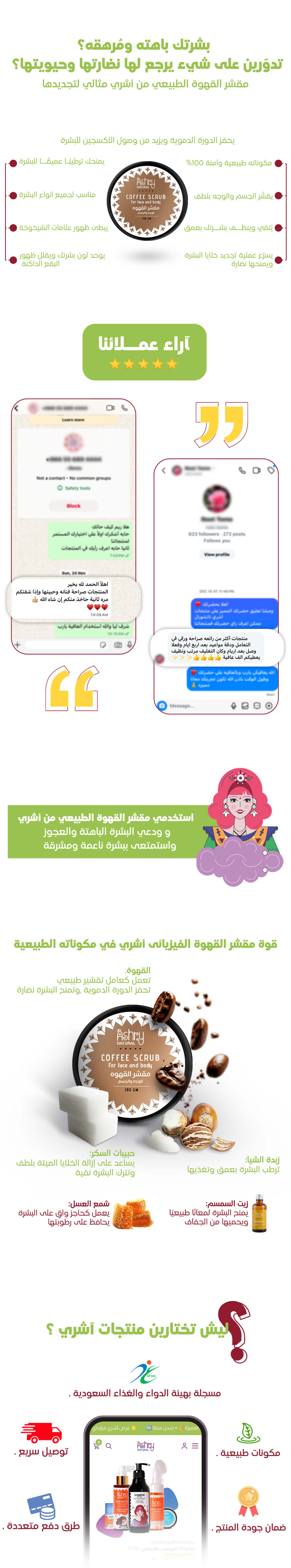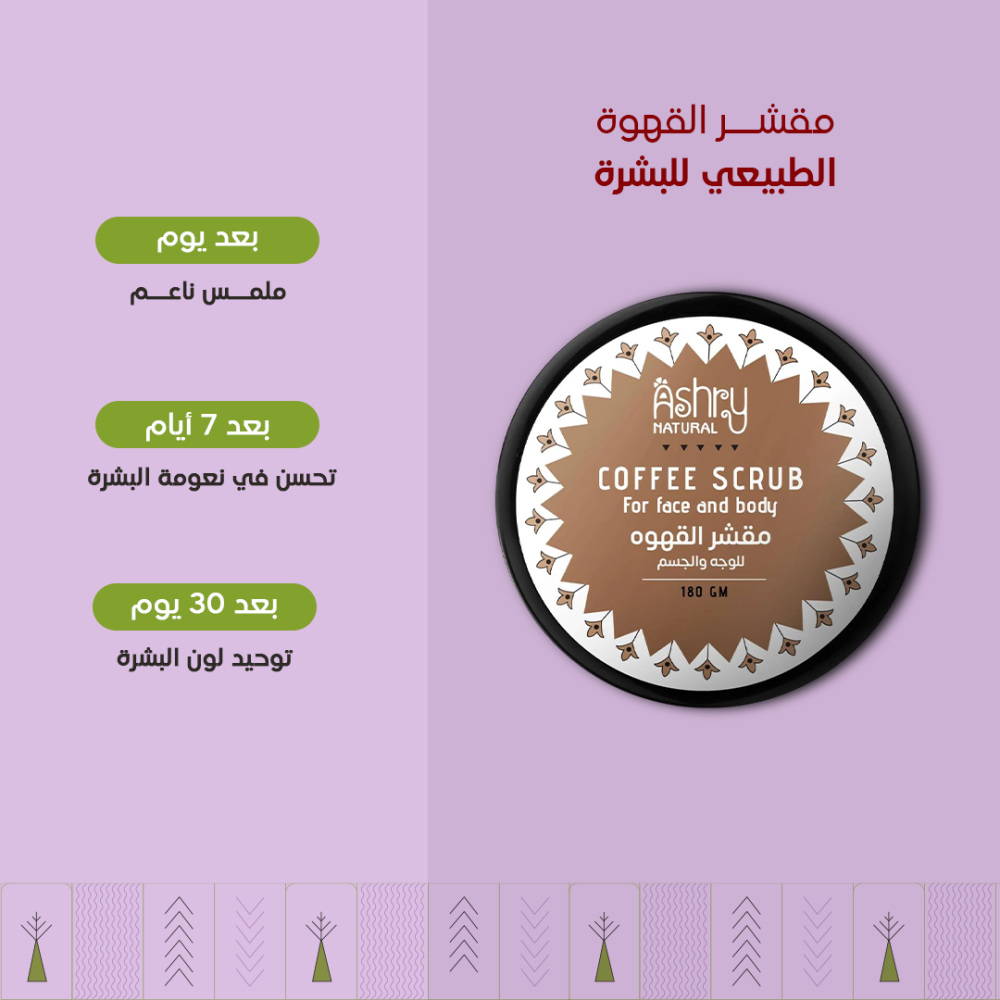 امنحي بشرتك العناية التي تستحقها مع مقشر القهوة الطبيعي من أشري ناتشورال – تركيبة فيزيائية فعّالة تعمل بلطف على إزالة الجلد الميت وتنقية المسام، وتترك بشرتك ناعمة ونضرة من أول استخدام.